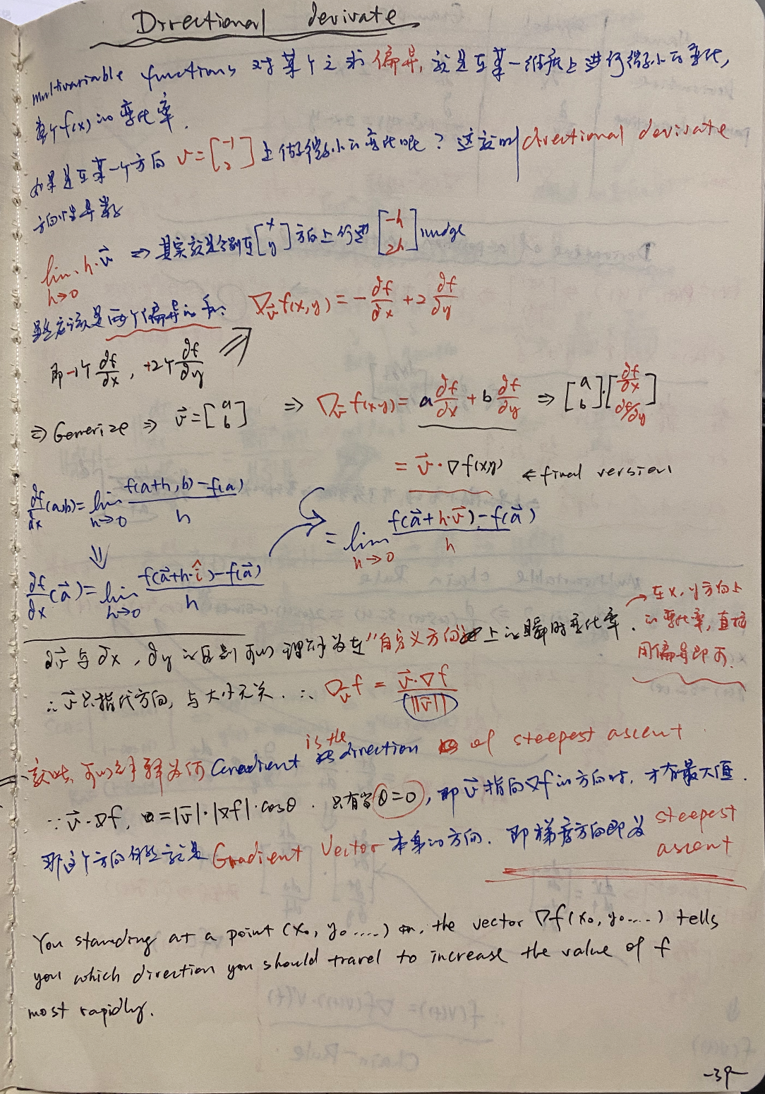 可以拿这个当成结论,也可以去感性认识,而要去证明的话,网上有数不清的教程,在花书(《Deep Learning深度学习》)和可汗学院里,都是用的directional derivate来解释(证明)的,即”自定义方向上的瞬时变化率“,也是我认为在如果有多变量微积分的基础下,比较容易让人接受且简单直白的解释: