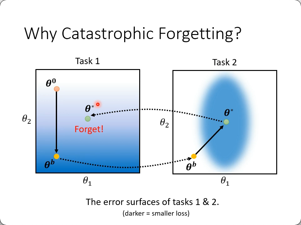 在任务1上学到的参数,到任务2里接着训练,顺着梯度到了任务2的最优参数,显然不再是任务1的做以参,这叫灾难性的遗忘