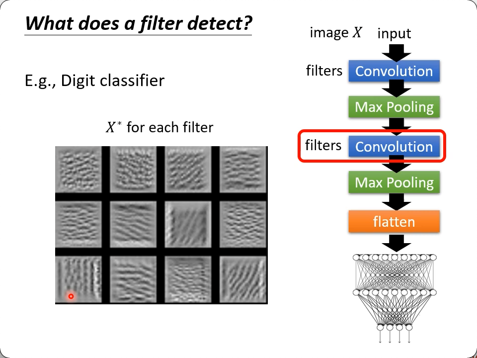 然后再去观察$X^*$有什么特征,就基本上可以认定这个(训练好的)filter提取的是什么样的patten了。