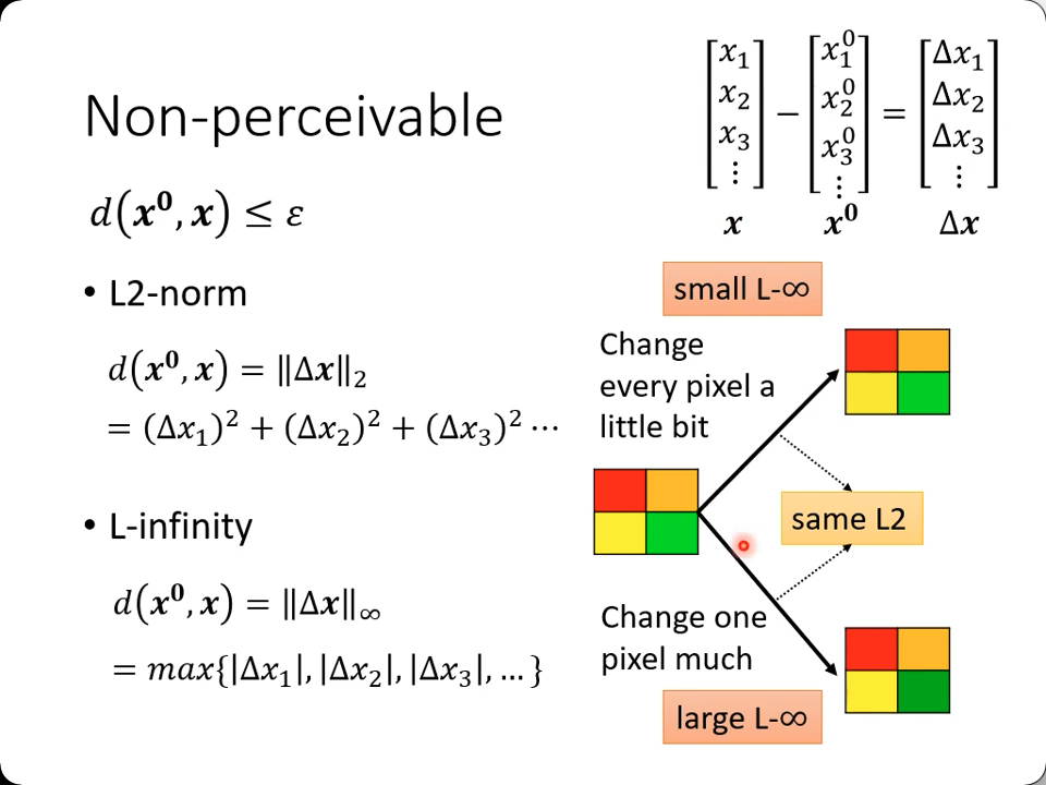 图上可知,如果都改变一点点,和某一个区域改动相当大,可能在L2-norm的方式计算出来是一样的,但是在L-infinity看来是不一样的(它只关心最大的变动)。