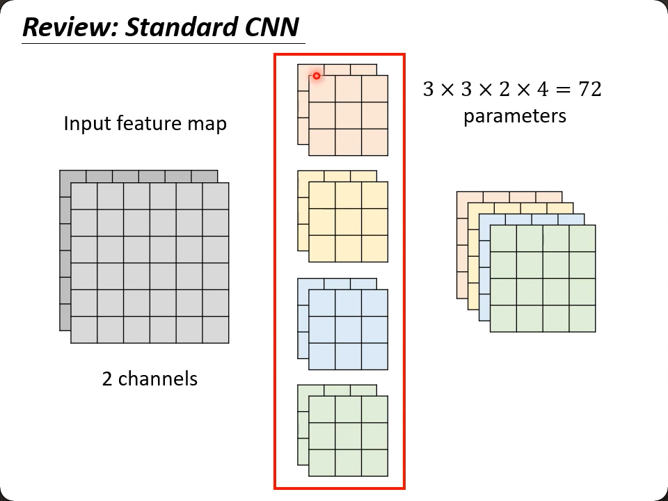 - 应用标准卷积参数量:(1x1) x in_channel x out_channel