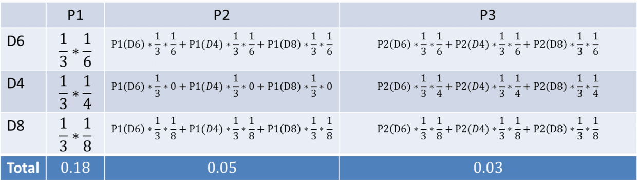 - 1,6,3 => P3(D4) = P2(D6) * P(3|D4) * P(D4) = $\frac{1}{216} \cdot \frac{1}{3} \cdot \frac{1}{4}$